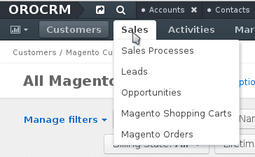 Los CRM de los que hemos hablado antes tienen un enfoque muy orientado a B2B, con el clásico embudo de ventas y sus respectivas etapas (prospecto, calificación, presupuesto, negociación, cierre…). En el caso de oroCRM, te permite compaginar el clásico modelo del embudo de ventas B2B, con uno más orientado al modelo de retail B2C puro y duro. Para ser más concretos, te separa los clientes que proceden de la base de datos de Magento y, dichos clientes, te permite separarlos en función de si vienen por el portal B2B o por el portal B2C (en caso de que Magento tenga dos frontales diferentes, uno para cada modelo de negocio).